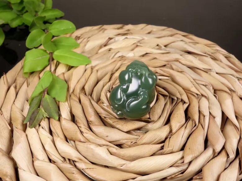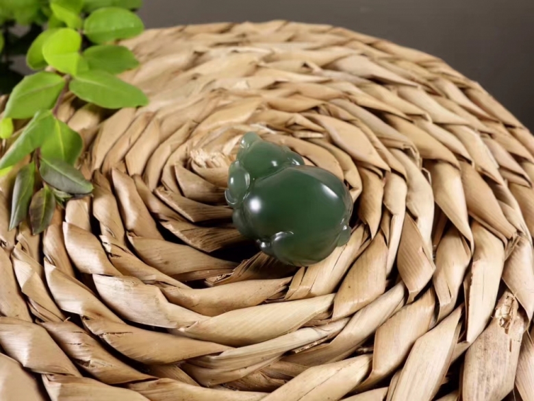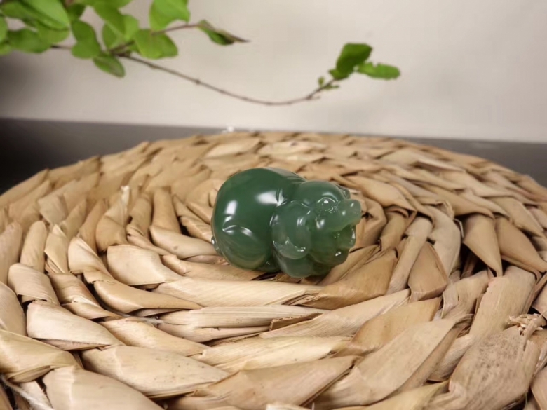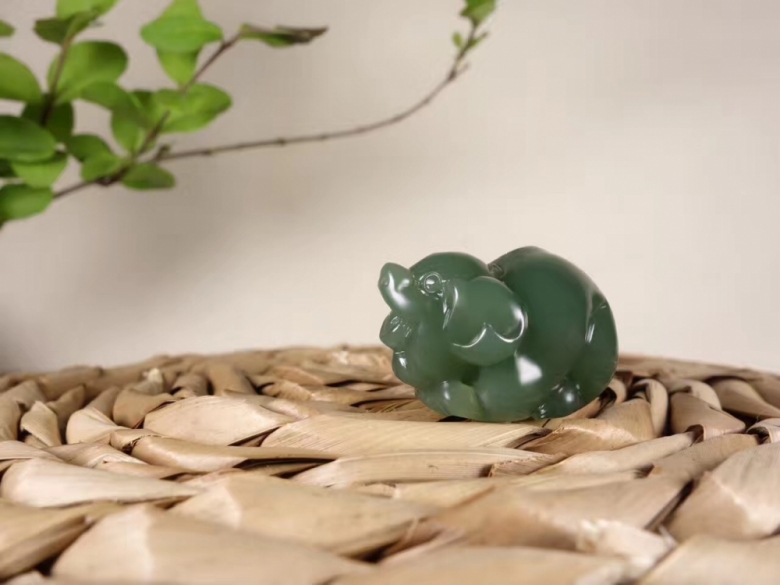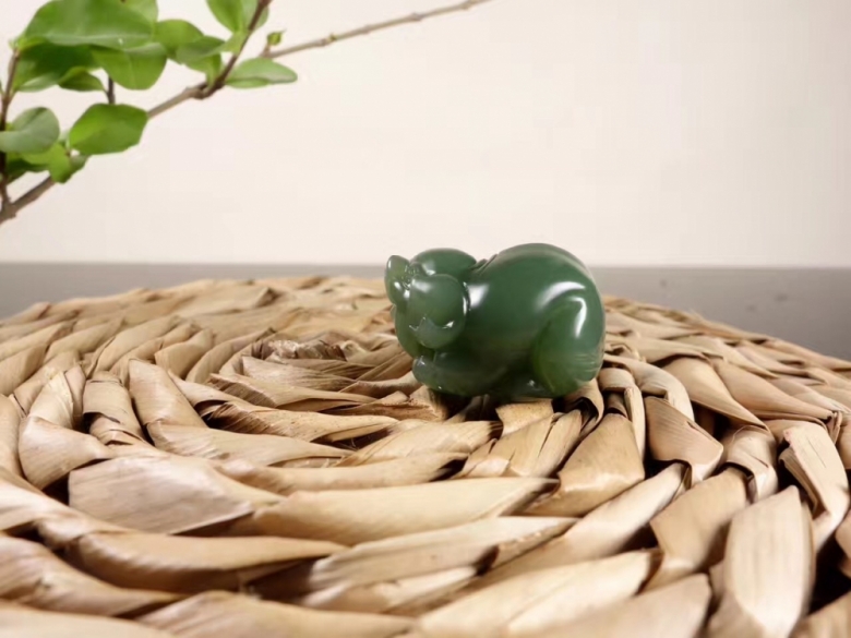 【招財進寶】和田玉碧玉,玉質(zhì)油潤,細(xì)膩,結(jié)構(gòu)緊致,純凈無雜。刀工精湛,精雕小豬,自然和諧,豬的形象肥頭大耳,長著一副富態(tài)之相,渾身是寶,加上豬在我國傳統(tǒng)文化中也是財富的象征。作品寓意大富大貴、財源滾滾、招財進寶。17g 28×20×18mm