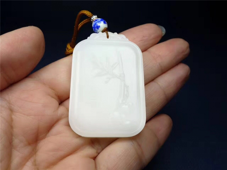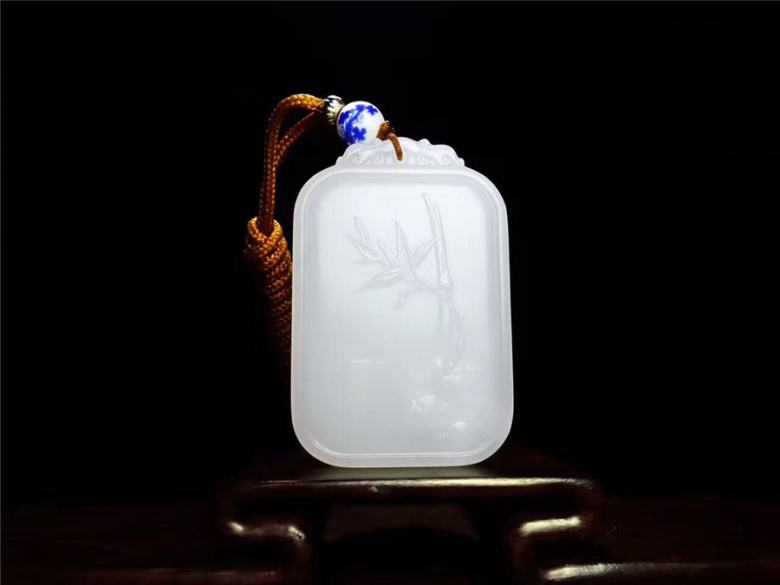 【竹】和田玉山料,玉質(zhì)白皙,上手溫潤,光澤內(nèi)斂,結(jié)構(gòu)均勻緊致。牌面浮雕竹節(jié),精致細巧。刀法細致,自然傳神。竹子節(jié)節(jié)高的生長規(guī)律,意為步步高升。竹枝繁葉茂、一節(jié)比一節(jié)高的特點寓意著學(xué)業(yè)有成、節(jié)節(jié)向上。 35g 51*34*9mm