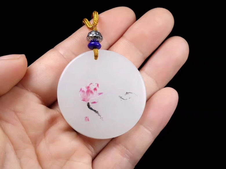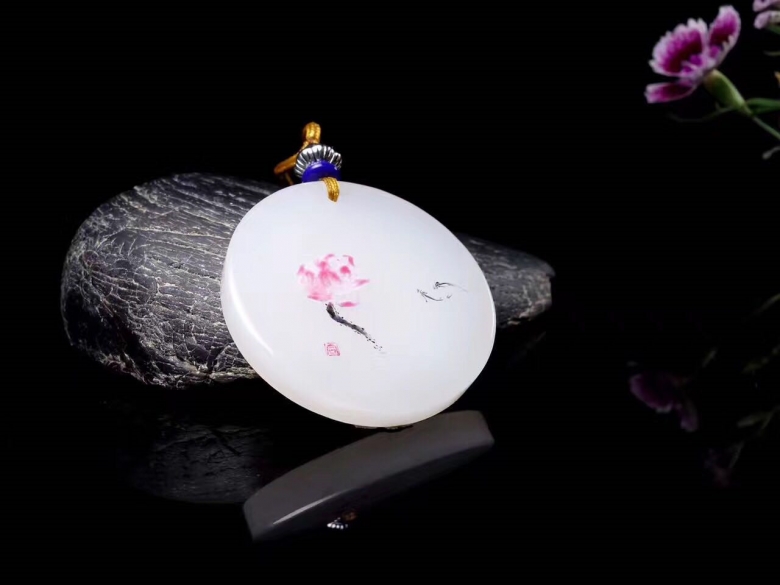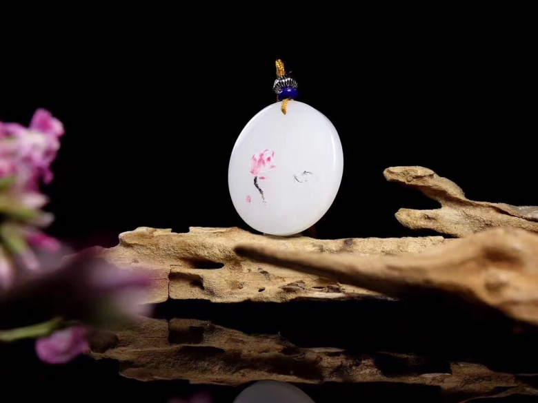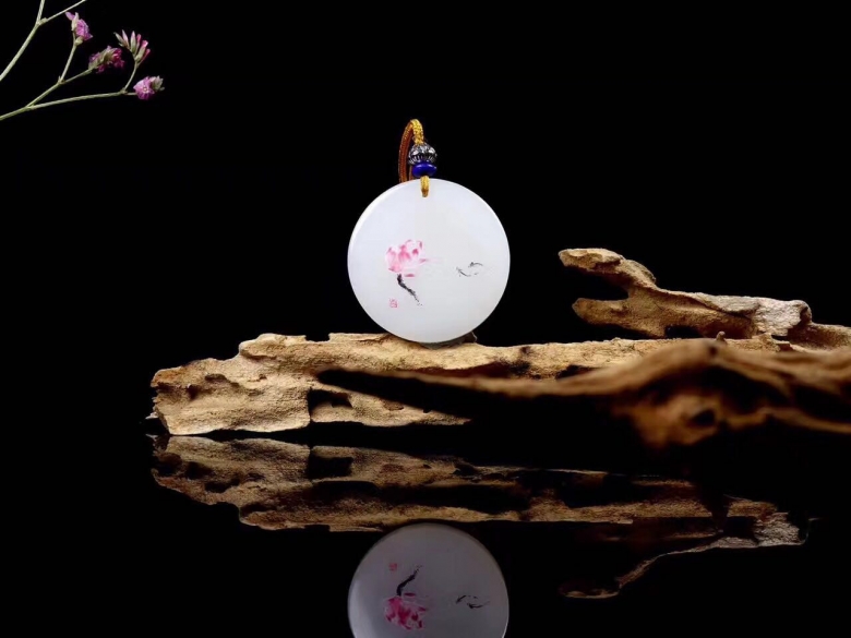 【蓮兒喚魚夢(mèng)】和田玉,清荷婉立凈池中,清香益遠(yuǎn)惹魚夢(mèng)。若問仙子為何羞,只見盛時(shí)驚花容?;ò觑h灑落水間,引魚兒前來,似夢(mèng)如幻的景象??茨撬锼?,天上人間。神魚賜福,年年有余;美妙圣地,心曠神怡。靜心體味那如蓮的時(shí)光……作品選材于和田玉山料,白玉的紋理不琢而自成一幅美麗的天然畫面。根據(jù)玉石的天然紋理,采用微線雕的技法,刻畫出蓮兒喚魚夢(mèng)的唯美畫面。22g 39×39×6mm