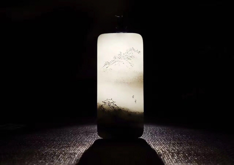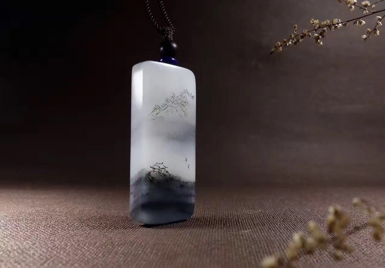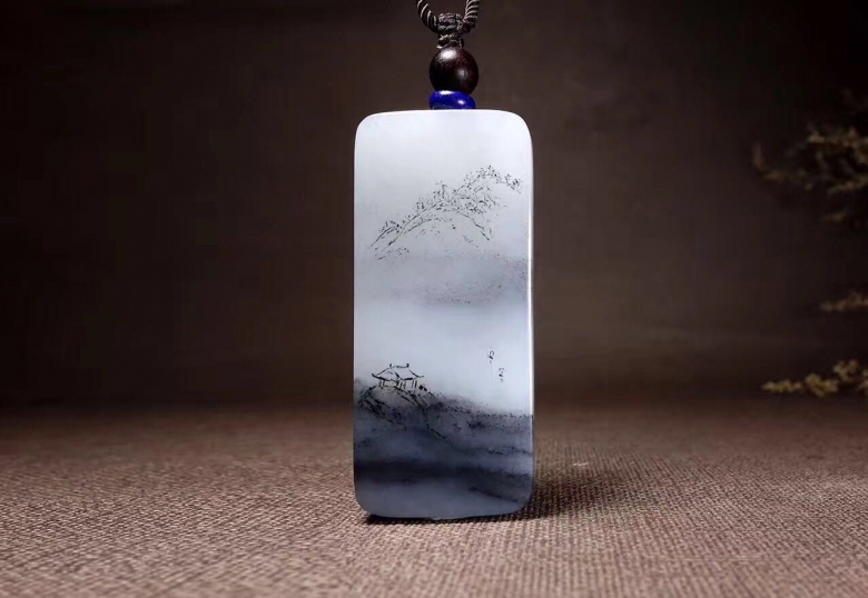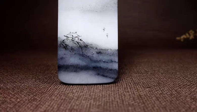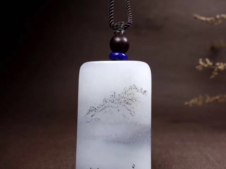 【望岳】作品為山水意境方牌,青花墨白相間將遠(yuǎn)山近景帶 入作品,線雕手法簡(jiǎn)潔流暢展現(xiàn)出青花意境的自然神韻,作品完美呈現(xiàn)云霧繚繞,峰巒聳立的仙境 。岱宗夫如何?齊魯青末了。造化鐘神秀,陰陽割昏曉。蕩胸生層云,決眥入歸鳥。會(huì)當(dāng)凌絕頂, 一覽眾山小。47g 63/28/10mm