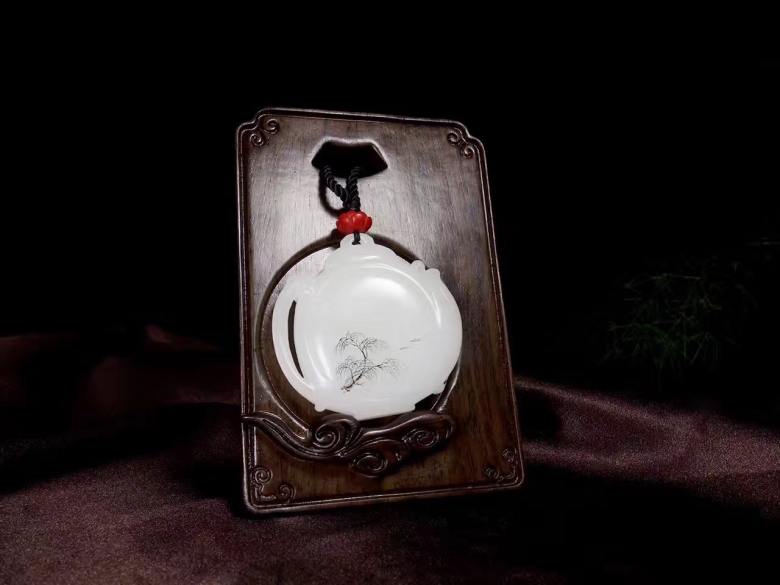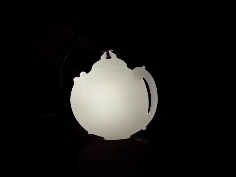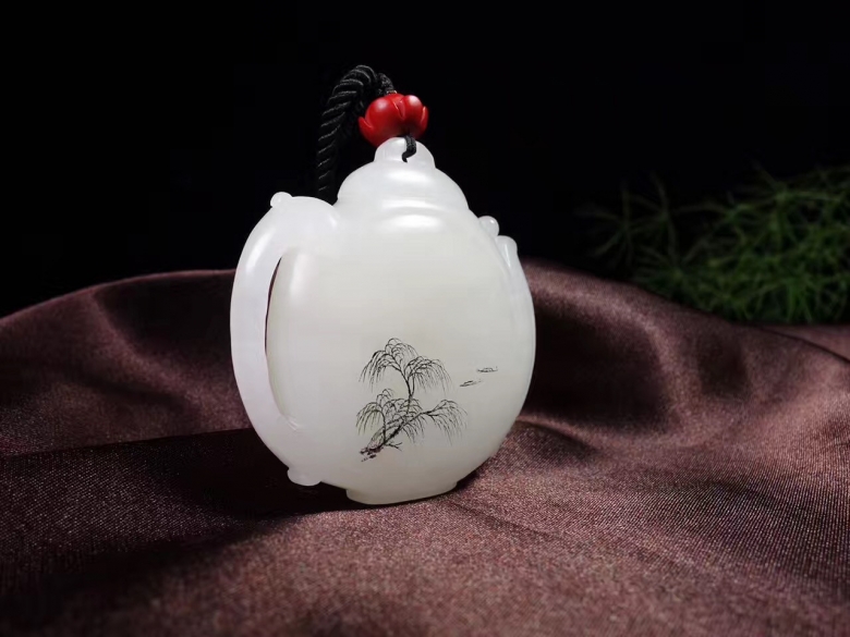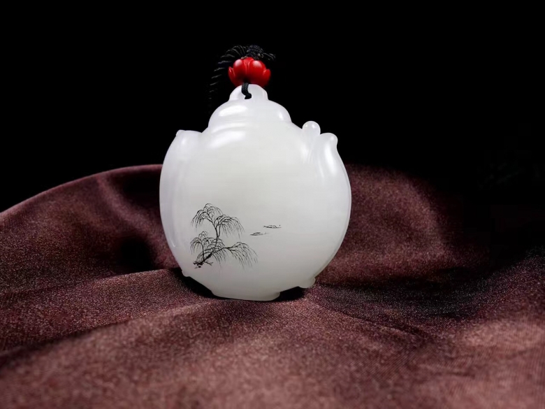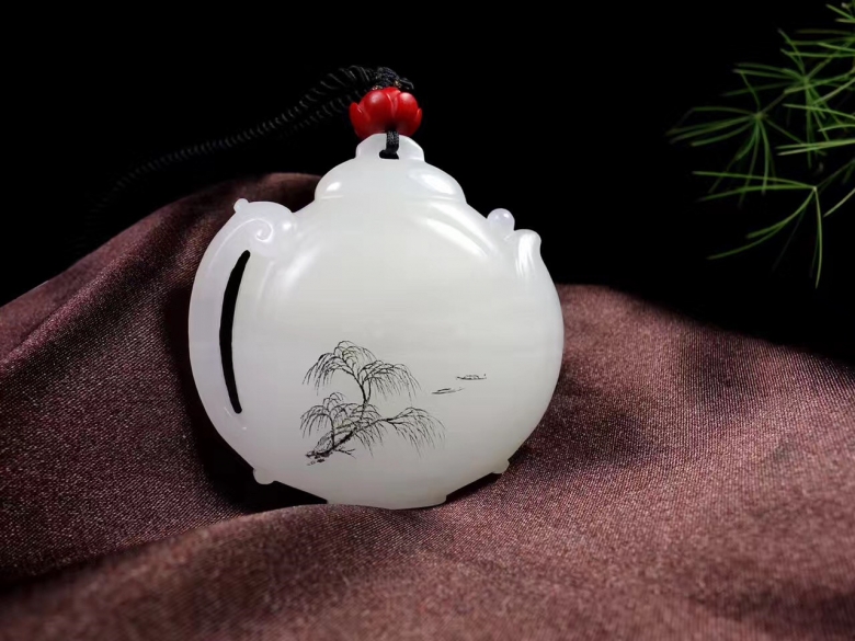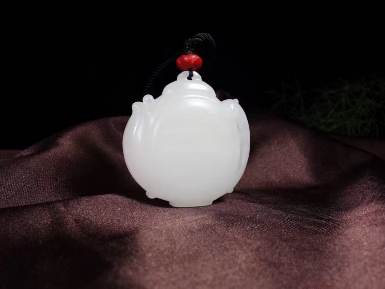 【文心玉壺】和田玉白玉,以玉壺為造型,刻畫細(xì)致,形象逼真,舊時一句“一片冰心在玉壺”流傳千古,讓玉壺成為代表“淡泊明志”的美好物象。湖水清澈,湖面水平如鏡,倒映著天空中的白云,隱約可見遠(yuǎn)處連綿的群山,玉石本身的紋理自成一福美麗的山水畫面。 66g 52/54/15mm
