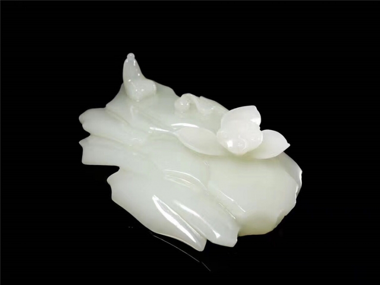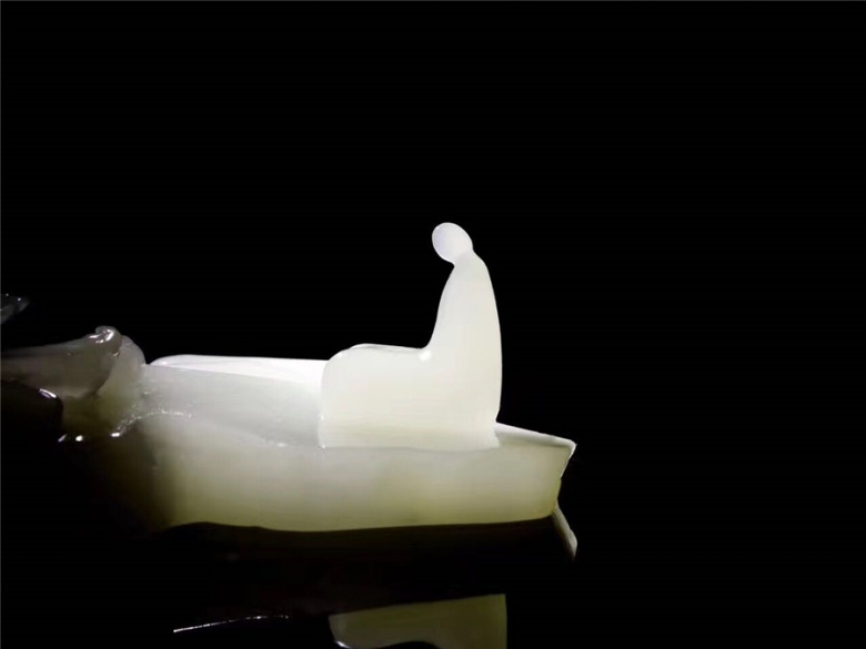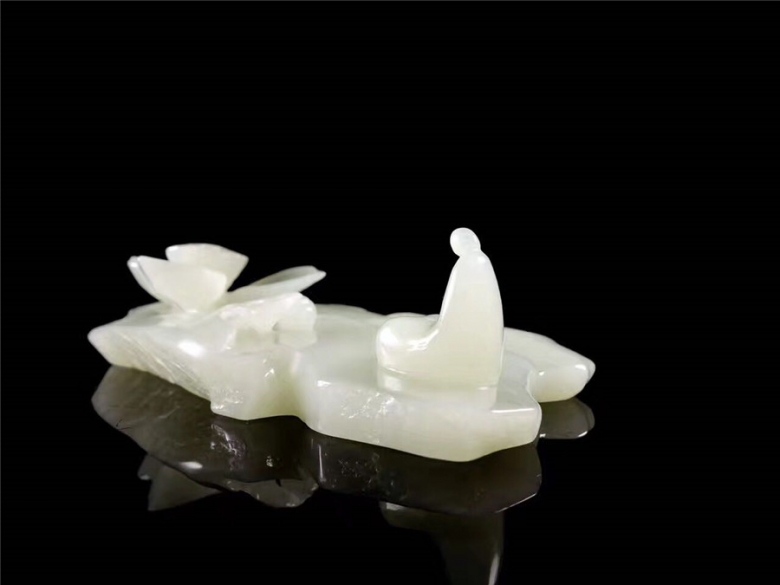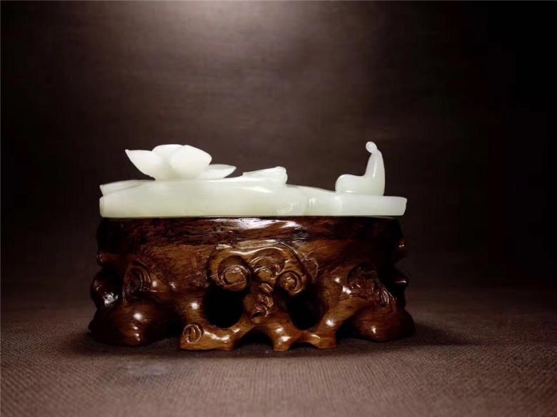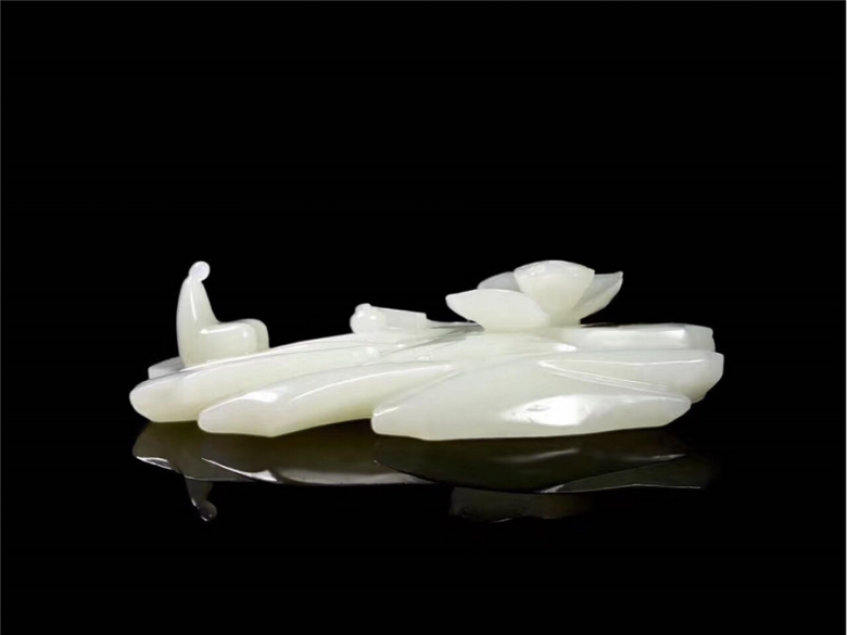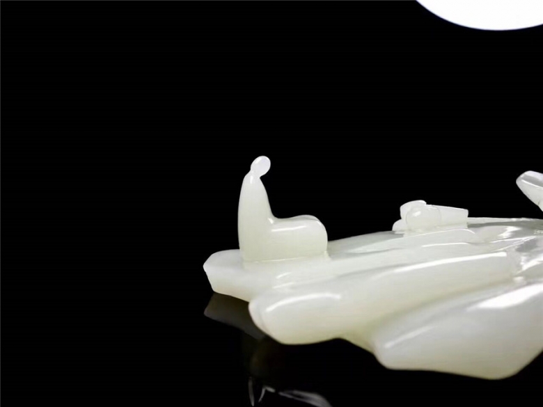 【蓮花悟道】和田玉山料。玉質(zhì)油潤細膩,意境悠然淡雅。荷葉舒卷自如,參禪者坐蓮而生,境觀香云,心隨香云轉(zhuǎn),境由心造,似動非動,若隱若現(xiàn)。沉香煙斷玉爐寒,伴我清懷如水,繁華世界,獨處又何妨。華燈初上書作伴,一線熏香境悠然。251g 125/73/30mm