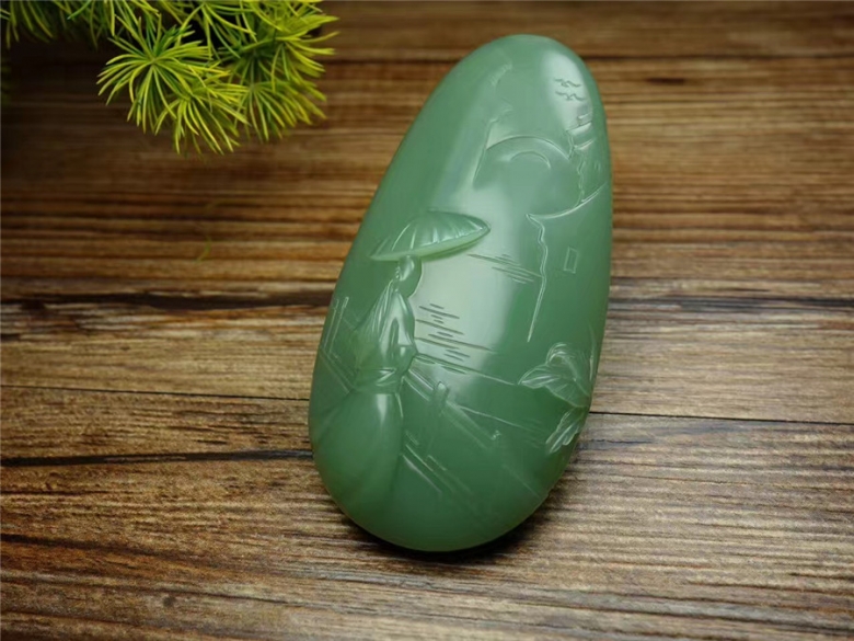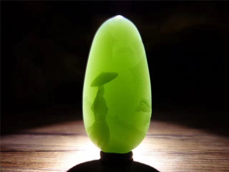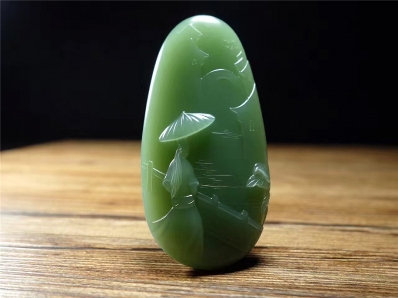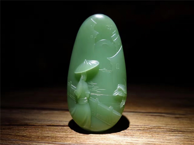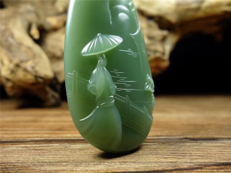 【斷章】和田玉碧玉,料子細(xì)可過燈,油潤感十足,過燈結(jié)構(gòu)完美無瑕疵,整器設(shè)計(jì)巧妙,布局精巧,刀工流暢,美玉如畫,亭臺(tái)水榭、木閣畫樓、回廊巷陌、蒙蒙的細(xì)雨、浮動(dòng)的槳聲、咿呀的烏篷船、蜿蜒的流水。小橋上,有一位佳人,溫婉淡雅,長發(fā)如瀑,衣袂飄飄,撐一柄油紙傘,眺望著遠(yuǎn)處的風(fēng)景。65g 75/38/15mm
