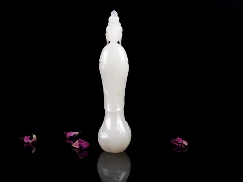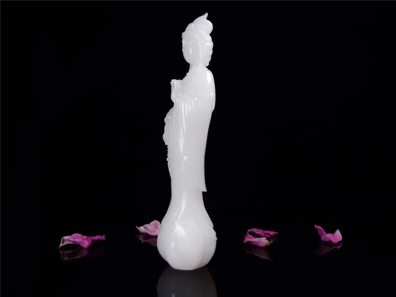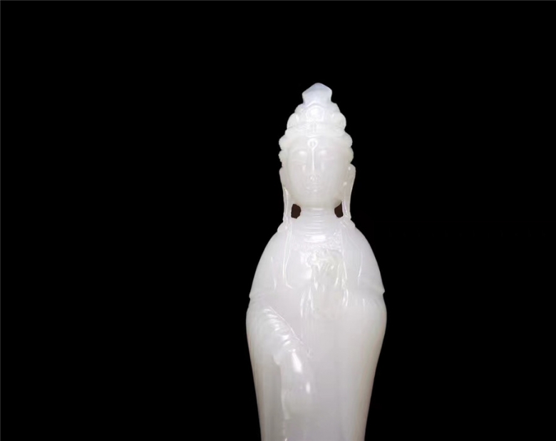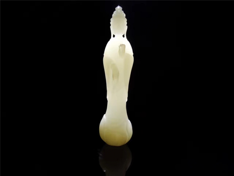 【觀音大士】和田山料,玉質(zhì)溫潤細(xì)膩,油潤度佳,精雕觀音手持佛珠站于蓮花寶盤之上,面容慈祥,面首微微垂,閉目沉思,然而又不怒自威,法相莊嚴(yán),給人以信念。觀音慈容,悲天憫人,觀之莫不肅然起敬,沐手焚香,至誠頂禮。66g 107/26/18mm