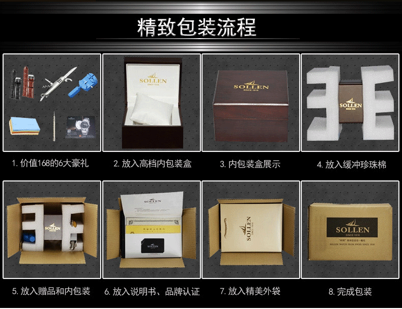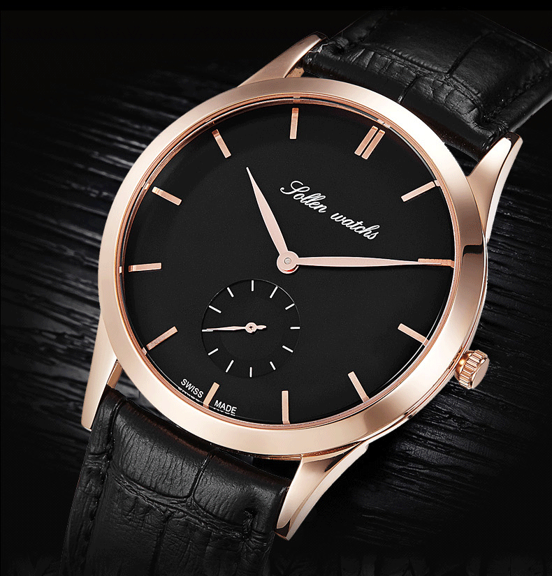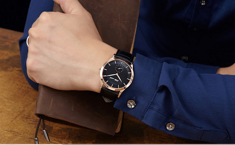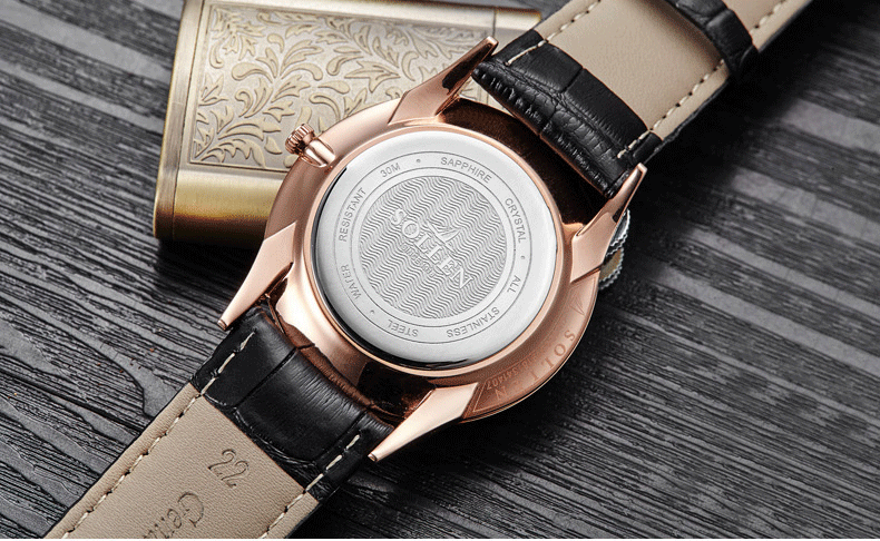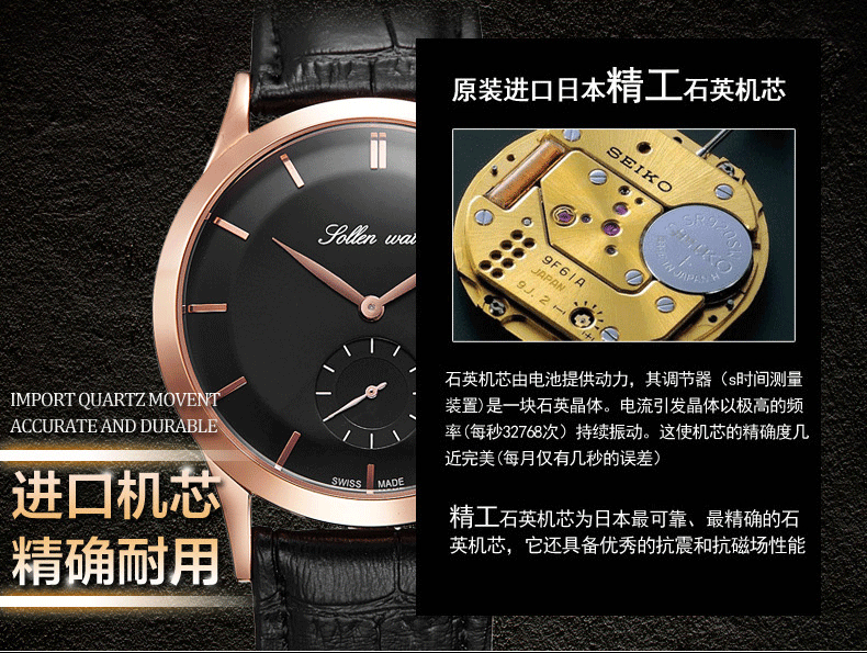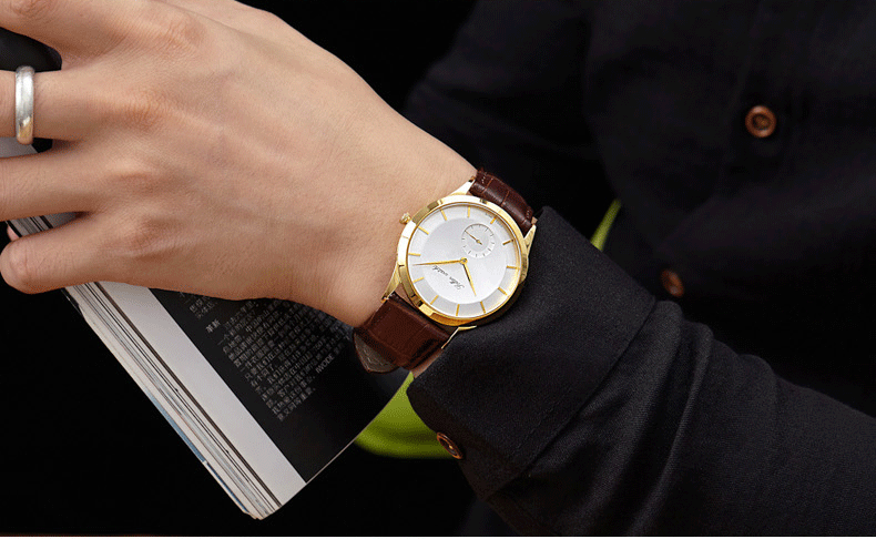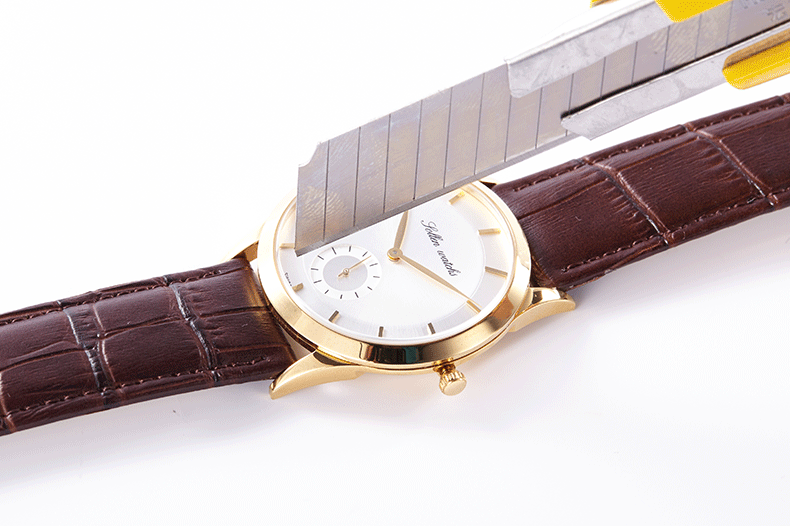 表殼材質(zhì):鋼 表帶材質(zhì):真皮 電鍍質(zhì)量:全IPG金 機芯:VD78 手表顏色:金色 防水:3ATM 底蓋:啤底 表扣:蝴蝶扣