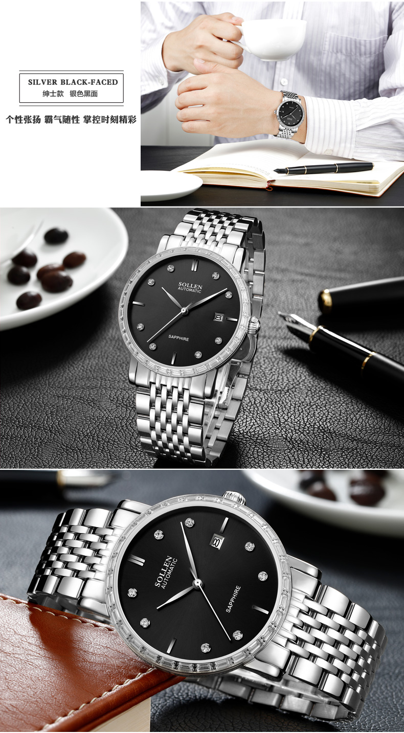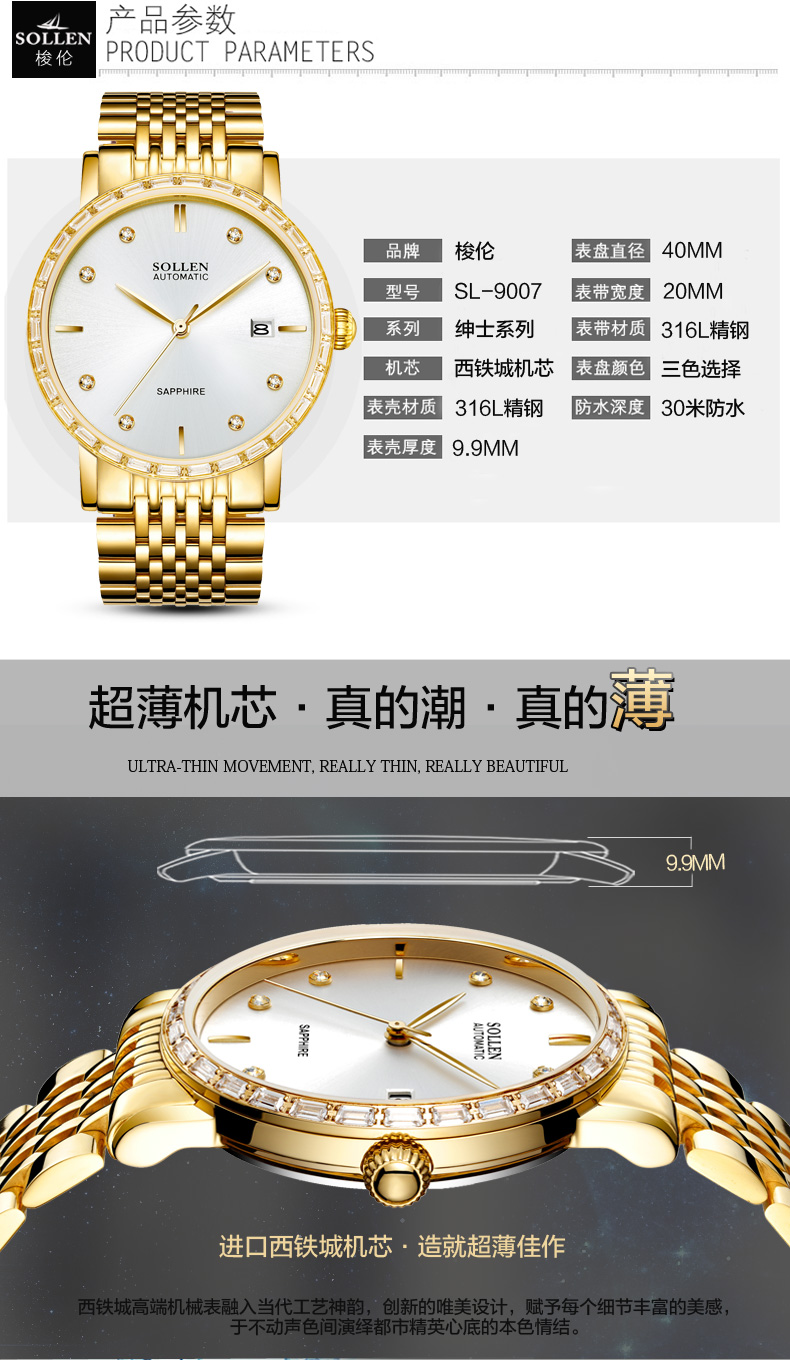 梭倫sollen 男士商務(wù)鋼帶全自動(dòng)機(jī)械表 帶日歷美優(yōu)達(dá)高端機(jī)芯 9007 玫瑰金